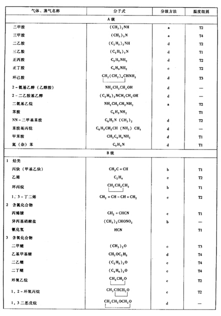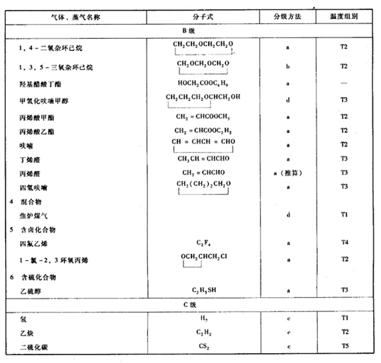 。(biāo)準(zhǔn)的附錄) 檢驗程序1] 采用說明: 1]IEC60079-0中無此附錄。根據(jù)我國具體情況和檢驗工作的需要,按照GB3836.1(第1版)的有關(guān)規(guī)定提出。 A1 各單位按本標(biāo)準(zhǔn)及1.2防爆型式專用標(biāo)準(zhǔn)試制的電氣設(shè)備,均須送國家授權(quán)的質(zhì)量監(jiān)督檢驗部門按相應(yīng)標(biāo)準(zhǔn)的規(guī)定進(jìn)行檢驗。對已取得“防爆合格證”的產(chǎn)品,其他廠生產(chǎn)時,仍須重新履行檢驗程序。 A2 檢驗工作包括技術(shù)文件審查和樣機(jī)檢驗兩項內(nèi)容。 A3 技術(shù)文件審查須送下列資料: a) 產(chǎn)品標(biāo)準(zhǔn)(或技術(shù)條件); b) 與防爆性能有關(guān)的產(chǎn)品圖樣(須簽字完整,并裝訂成冊)。 以上資料各一式二份,審查合格后由檢驗部門蓋章,一份存檢驗部門,一份存送檢單位。 c) 按23.2規(guī)定檢驗單位認(rèn)為確保電氣設(shè)備安全性必要的其他資料。 A4 樣機(jī)檢驗須送下列樣機(jī)及資料: a) 提供符合合格圖樣的完整樣機(jī),其數(shù)量應(yīng)滿足試驗的需要。檢驗部門認(rèn)為必要時,有權(quán)留存樣機(jī); b) 產(chǎn)品使用維護(hù)說明書一式二份,審查合格后由檢驗部門蓋章,一份存檢驗部門,一份存送檢單位; c) 提供檢驗需要的零、部件和必要的拆卸工具; d) 有關(guān)試驗報告: 以上試驗報告和記錄各一份。 e) 有關(guān)的工廠產(chǎn)品質(zhì)量保證文件資料。 A5 樣機(jī)檢驗合格后,由檢驗部門發(fā)給“防爆合格證”,有效期為五年。 A6 取得“防爆合格證”后的產(chǎn)品,當(dāng)進(jìn)行局部更改且涉及相應(yīng)標(biāo)準(zhǔn)的有關(guān)規(guī)定時,須將更改的技術(shù)文件和有關(guān)說明一式二份送原檢驗部門重新檢驗,若更改內(nèi)容不涉及相應(yīng)標(biāo)準(zhǔn)的有關(guān)規(guī)定時,應(yīng)將更改的技術(shù)文件和說明送原檢驗部門備案。 A7 采用新結(jié)構(gòu)、新材料、新技術(shù)制造的電氣設(shè)備,經(jīng)檢驗合格后,發(fā)給“工業(yè)試驗許可證”。取得“工業(yè)試驗許可證”的產(chǎn)品,須經(jīng)工業(yè)試驗(按規(guī)定的時間、地點和臺數(shù)進(jìn)行)。由原檢驗部門根據(jù)所提供的工業(yè)試驗報告、本標(biāo)準(zhǔn)和專用標(biāo)準(zhǔn)的有關(guān)規(guī)定,發(fā)給“防爆合格證”后,方可投入生產(chǎn)。 A8 對于既適用于Ⅰ類又適用于Ⅱ類的電氣設(shè)備,須分別按Ⅰ類和Ⅱ類要求檢驗合格,取得防爆合格證。 A9 檢驗部門有權(quán)對已發(fā)給“防爆合格證”的產(chǎn)品進(jìn)行復(fù)查,如發(fā)現(xiàn)與原檢驗的產(chǎn)品質(zhì)量不符且影響防爆性能時,應(yīng)向制造單位提出意見,必要時撤銷原發(fā)的“防爆合格證”。 注:檢驗部門在”防爆合格證“有效期內(nèi)至少應(yīng)對獲證產(chǎn)品進(jìn)行一次復(fù)查,包括對制造單位產(chǎn)品質(zhì)量保證條件核查。 附錄B 。ㄌ崾镜母戒洠 氣體和蒸氣按其最大試驗安全間隙(MESG) 和最小點燃電流(MIC)分級1] 采用說明: 1]IEC60079-0中該附錄為附錄A。 對”隔爆型“電氣設(shè)備而言,氣體和蒸氣的分級是以最大試驗安全間隙(MESG)為基礎(chǔ),在一個間隙長度為25mm的試驗容器內(nèi)完成的,測定MESG的標(biāo)準(zhǔn)方法是用IEC79-1A文件規(guī)定的試驗容器;關(guān)于只有一個容積為8升的球形容器內(nèi),在間隙附近點火進(jìn)行測定的方法,只有當(dāng)有新規(guī)定的才予以修改。 極限值為: A級 MESG大于0.9mm; B級 MESG0.5mm~0.9mm; C級 MIESG小于0.5mm。 對于本質(zhì)安全型電氣設(shè)備,氣體和蒸氣的分級是以它們的最小點燃電流(MIC)與實驗室用甲烷的最小點燃電流之比為基礎(chǔ)確定的。測定MIC比值的標(biāo)準(zhǔn)方法,必須是采用IEC79-3規(guī)定的“本質(zhì)安全電路的火花試驗裝置”,要用其他儀器測定,只有當(dāng)有新的規(guī)定時才予以變更。 極限值為: A級 MIC比值大于0.8; B級 MIC比值0.45~0.8; C級 MIC比值小于0.45。 大多數(shù)氣體和蒸氣,在兩種測定中只進(jìn)行一種即可列入合適的級別,下列情況下只需進(jìn)行一種測定就可以。 A級 MESG大于0.9mm或MIC比值大于0.9; B級 MESG在0.55~0.9mm之間或MIC比值在0.5~0.8之間; C級 MESG小于0.5mm或MIC比值小于0.45。 在下列情況下既要測定MESG,也要測定MIC比值。 1) 在只測定MIC比值時,其值在0.8~0.9之間。要做出分級,就有必要再測定MESG。 2) 當(dāng)只測定MIC比值時,其值在0.45~0.5之間,要做出分級,就有必要再測定MESG。 3) 當(dāng)測定MESG時,其值在0.5mm~0..55mm之間。要做出分級,就有必要再測定MIC比值。 同一系列的物質(zhì)中某一氣體或蒸氣,可以從這系列分子量較小的另一物質(zhì)的測定結(jié)果中,初步推算出這種氣體或蒸氣屬于那一級。 下面表格中的氣體和蒸氣就是根據(jù)這個基本規(guī)則編制的。 各種氣體或蒸氣附帶的字母意義如下: a) MESG值分級; b) MIC比值分級; c) 既測定MESG,也測定MIC比值; d) 化學(xué)結(jié)構(gòu)相似性分級(初步分級)。 注 1 按體積計,含15%及以下氫氣的所有甲烷混合物都應(yīng)列入“工業(yè)用甲烷”。 2 為了使一氧化碳和空氣混合物在標(biāo)準(zhǔn)環(huán)境溫度下達(dá)到飽和,一氧化碳可以含有足夠的濕度。 未列入表中的氣體可按照MIC和MESG分類,但須注意其特殊性能(例如按照MIC和MESG列入ⅡC類,但它的爆