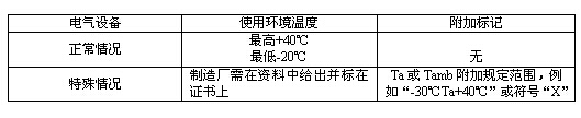 電氣設(shè)備應(yīng)設(shè)計在環(huán)境溫度為-20℃~+40℃下使用,在此時不需附加標(biāo)志。 若環(huán)境溫度超出上述范圍應(yīng)視為特殊情況,制造廠應(yīng)將環(huán)境溫度范圍在資料中給出,并在銘牌上標(biāo)出符號Ta或Tamb和特殊環(huán)境溫度范圍;或按27.2中9)規(guī)定在防爆合格證編號后加符號“X”(見表2)。 表2 使用環(huán)境溫度和附加標(biāo)記