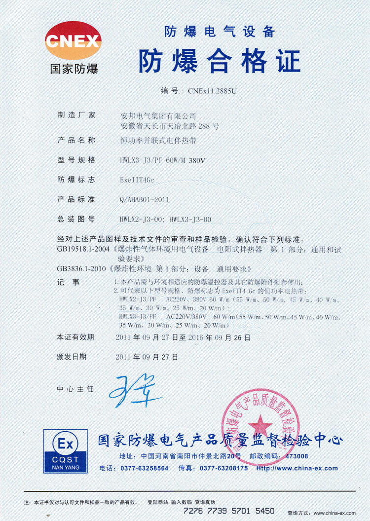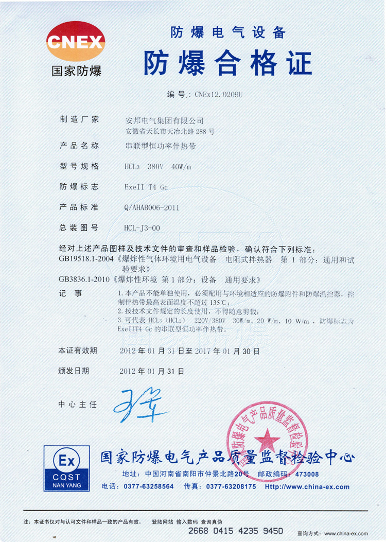 除了這兩種,還有自限溫系列的防爆產(chǎn)品合作證,這里就不一一例舉出來,您需要了解的話,可以直接瀏覽網(wǎng)站的“榮譽資質(zhì)”板塊。另外,提醒廣大的客戶,伴熱帶廠家很多,但是如何識別是否是正規(guī)的廠家,您可以讓對方提供一些資質(zhì),如果不放心,您也可以去相關(guān)的認證網(wǎng)站查詢。