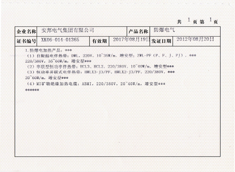 作為一個專業(yè)化的電伴熱帶廠家,除了產(chǎn)品質(zhì)量的保障之外,產(chǎn)品資質(zhì)也要齊全。很多客戶在尋找電伴熱合作廠家的時候,企業(yè)產(chǎn)品資質(zhì)是否齊全是考慮的首要因素。這里我們以常見的電伴熱帶生產(chǎn)許可證和產(chǎn)品的防爆合作證為例: